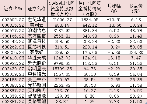 近期,北向資金開始布局部分算力概念股。同花順數據顯示,截至5月29日,北向資金共持有61只算力概念股,合計持股數量為10.37億股,以最新收盤價計算,北向資金持股市值達258.49億元。其中,16只概念股月內獲北向資金加倉,世紀華通月內北向資金合計增持數量居首,達到1834.05萬股,最新持股數量為21006.27萬股;美利云、浪潮信息、東方國信、潤澤科技、國芯科技等5只概念股月內北向資金加倉數量也均超200萬股。