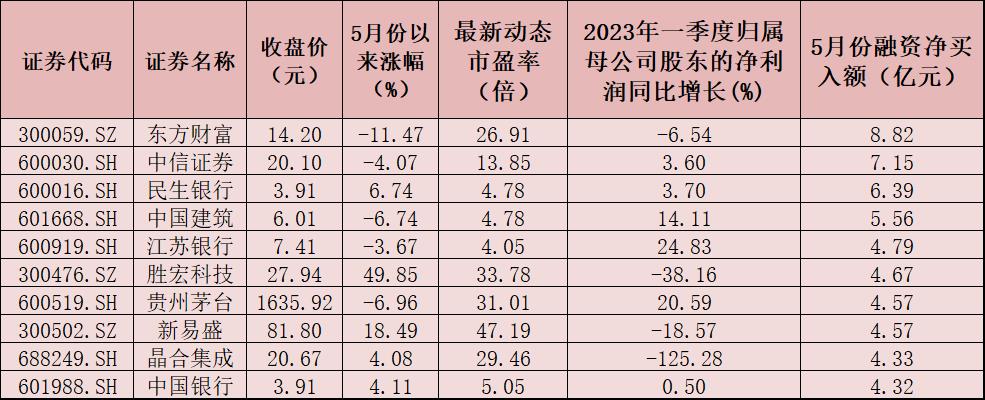 表:5月份融資凈買入額排名前十個股一覽