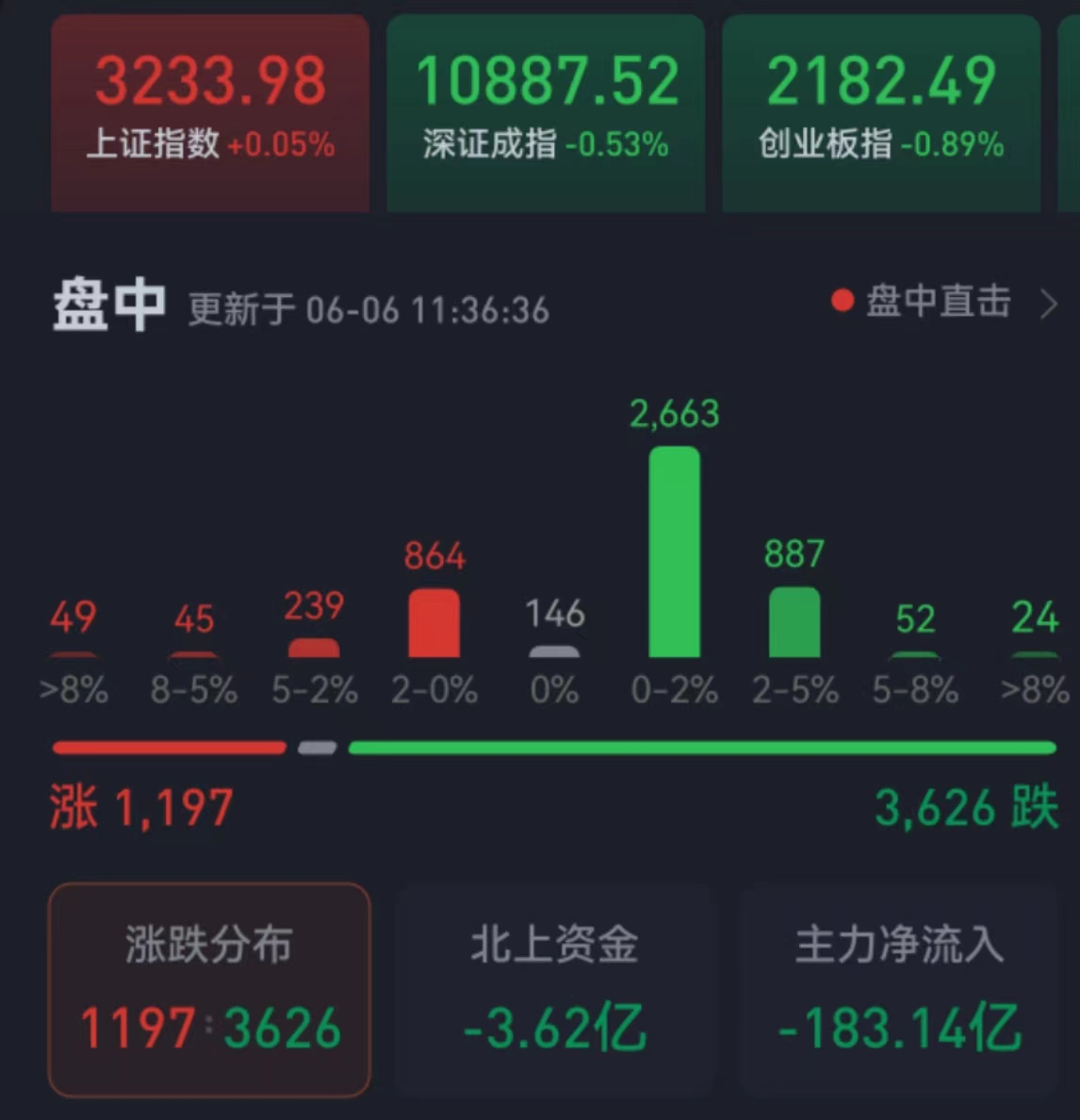 周二(6月6日),三大股指繼續震蕩整理。截至上午收盤,上證指數漲0.05%,報3233.98點;深證成指和創業板指分別跌0.53%和0.89%;滬深兩市合計成交額5505.6億元,總體來看,兩市個股跌多漲少。