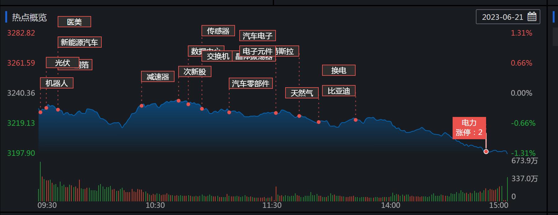 周三(6月21日),A股三大股指震蕩回落,全線飄綠。截至收盤,上證指數(shù)跌1.31%,報(bào)3197.9點(diǎn);深證成指跌2.18%,報(bào)11058.63點(diǎn);創(chuàng)業(yè)板指跌2.62%,報(bào)2211.84點(diǎn)。兩市合計(jì)成交金額10219億元,連續(xù)第6個(gè)交易日突破萬億元。北向資金凈賣出6.41億元。總體上看,兩市個(gè)股跌多漲少,超4000只個(gè)股下跌,其中,漲停個(gè)股達(dá)47只,跌停個(gè)股達(dá)20只。