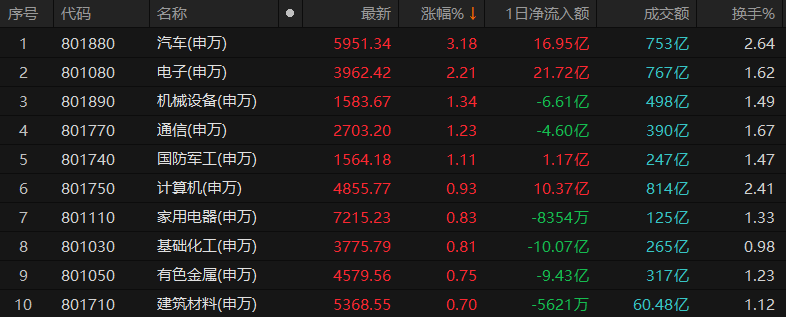 汽車行業(yè)漲3.18%居首