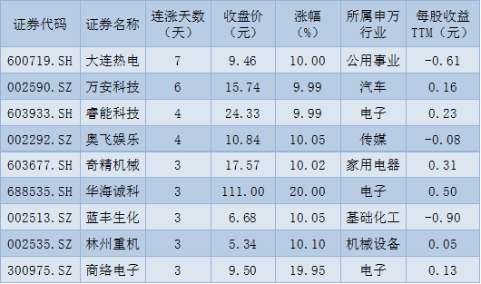 表:連續(xù)上漲3日且今日收盤漲停股一覽