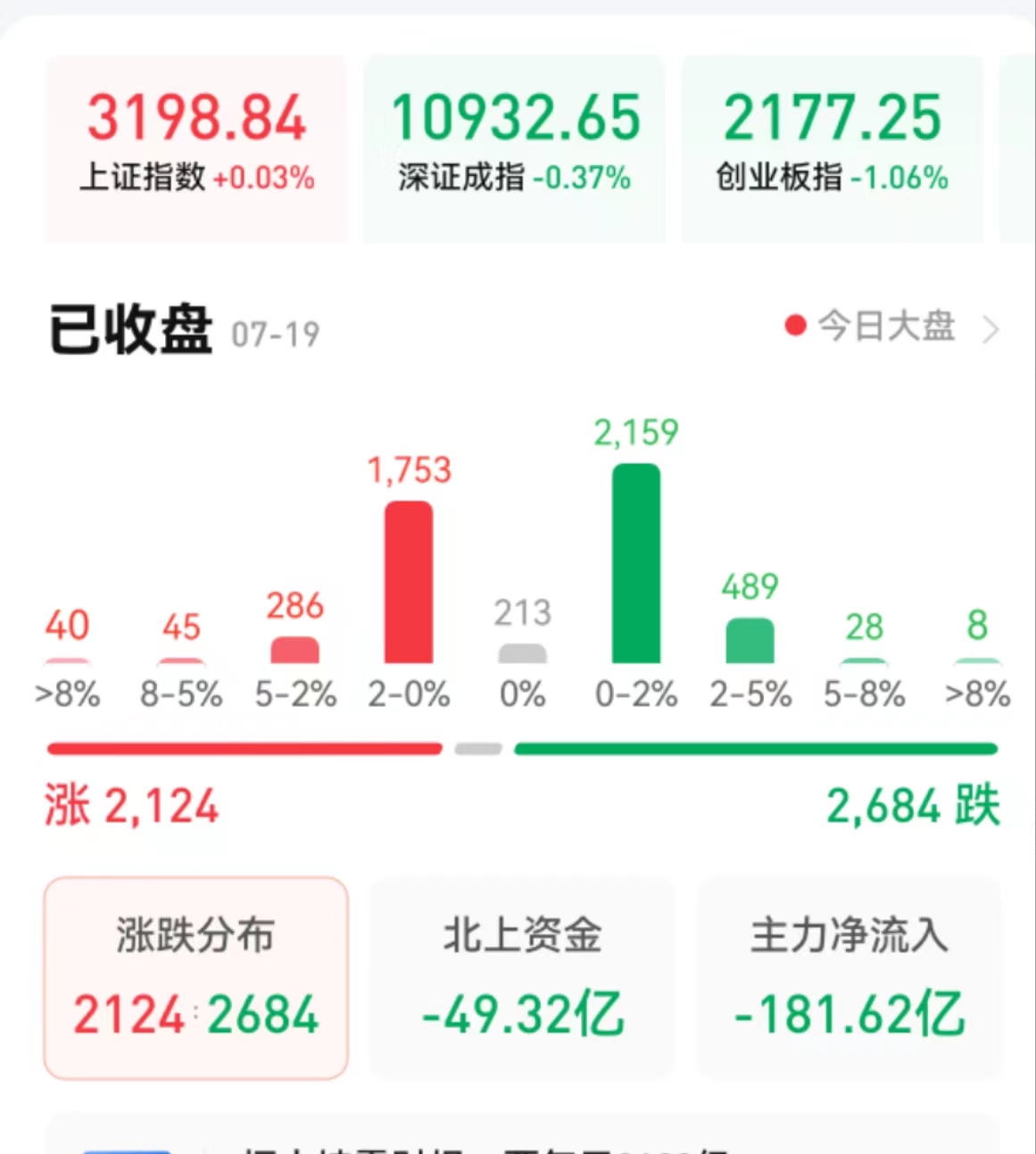 周三(7月19日),A股三大股指震蕩分化,漲跌不一。截至收盤,上證指數微漲0.03%報3198.84點,深證成指跌0.37%報10932.65點,創業板指跌1.06%報2177.25點,上證50指數漲0.22%;兩市合計成交7024.54億元,北向資金凈賣出49.32億元。總體上看,兩市個股跌多漲少。其中,漲停個股22只,跌停個股2只。