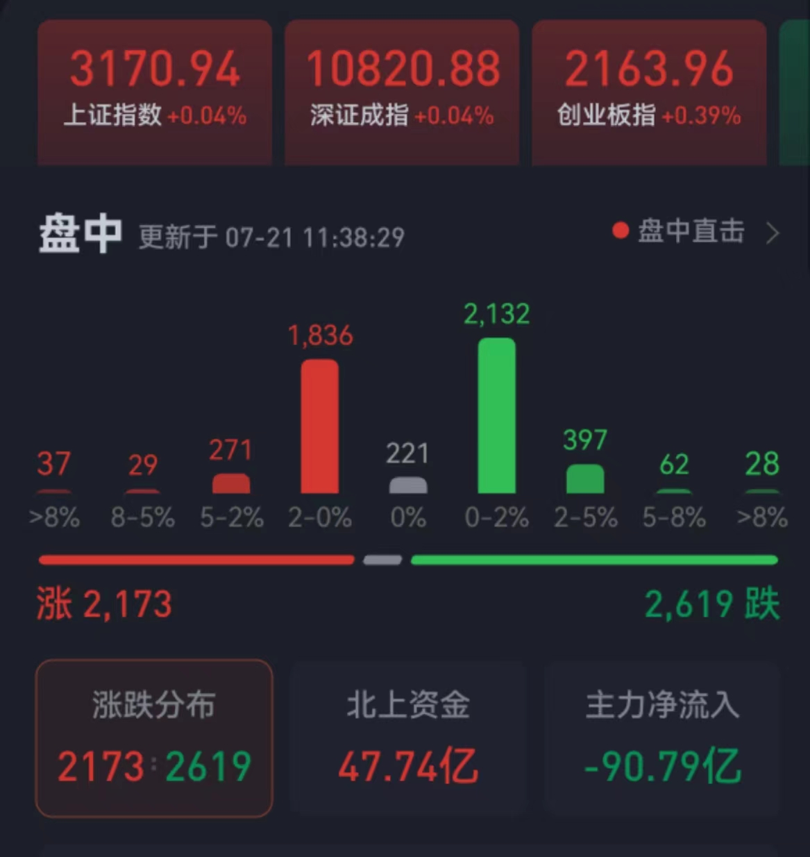 周五(7月21日),三大股指震蕩攀升,全線翻紅。截至上午收盤,上證指數微漲0.04%,報3170.94點;深證成指和創業板指分別漲0.04%和0.39%;滬深兩市合計成交額4350.1億元,總體來看,兩市個股跌多漲少。