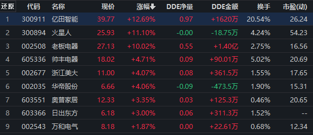 從早盤表現強勢的廚衛電器行業看,交易中的9只成份股全線上漲,其中,有3只個股漲幅超5%。