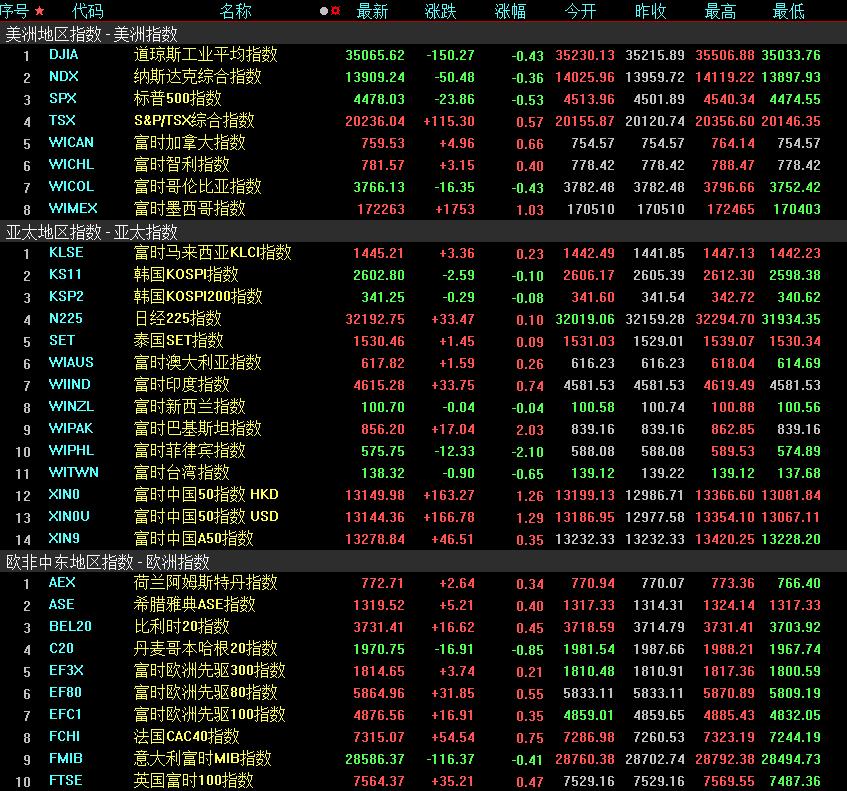 周五,美國三大股指全線收跌,道指跌0.43%報35065.62點,標普500指數跌0.53%報4478.03點,納指跌0.36%報13909.24點。本周,道指跌1.11%,標普500指數跌2.27%,納指跌2.85%。
