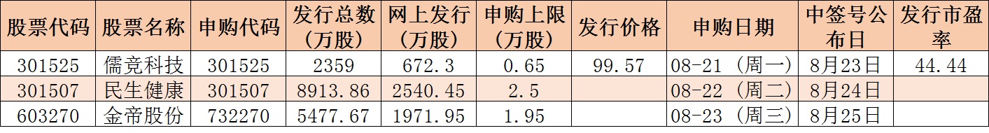 根據發行安排,下周(8月21日-25日)有3只新股發行,其中8月21日周一發行的是儒競科技,公司是專業變頻節能與智能控制綜合方案提供商,發行價為99.57元/股;8月22日周二發行的是民生健康,公司是集維生素與礦物質類非處方藥品和保健食品研發、生產、銷售于一體的高新技術企業;8月23日周三發行的是金帝股份,公司的主營業務為精密機械零部件的研發、生產和銷售。