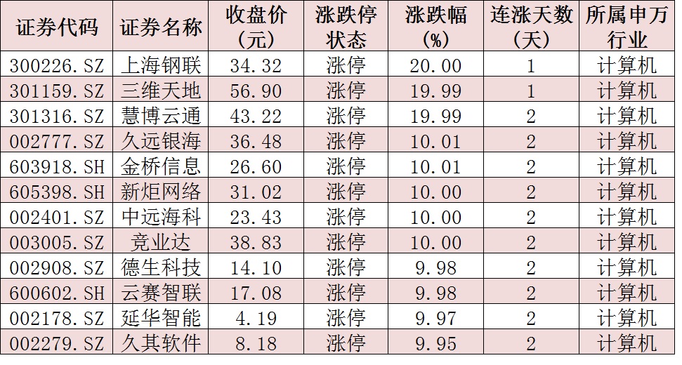 表:今日計(jì)算機(jī)行業(yè)中12只漲停股情況: