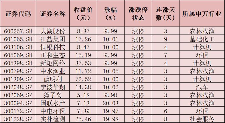 具體熱點來看,今日,貴金屬板塊領漲,中潤資源漲停,曉程科技、銀泰黃金、山東黃金等多只個股漲超5%;養殖業漲幅居前,國聯水產20CM漲停,好當家、中水漁業、獐子島等6只個股漲停;傳媒板塊表現強勢,上海電影、中國出版、橫店影視等多只個股漲停;高壓氧艙、預制菜、醫療服務、手機游戲、白酒概念等板塊表現活躍。建筑裝飾、減速器、高鐵、中船系等板塊跌幅居前。