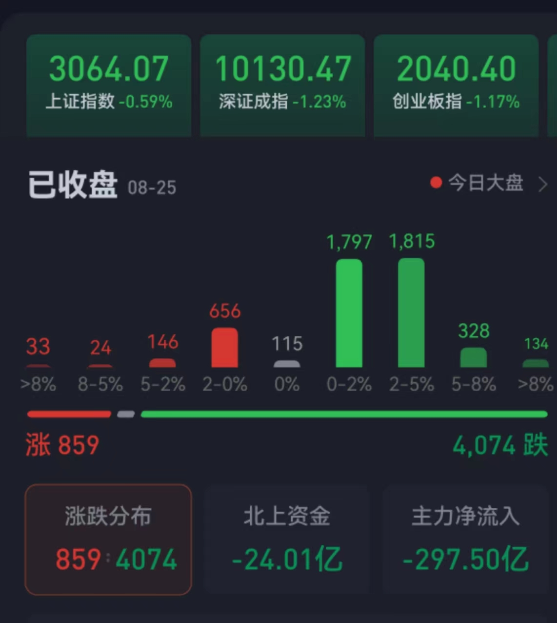 周五(8月25日),兩市合計成交金額7662.9億元,北向資金凈賣出24.01億元??傮w上看,兩市個股跌多漲少,超4000只個股下跌。其中,漲停個股達23只,跌停個股達39只。