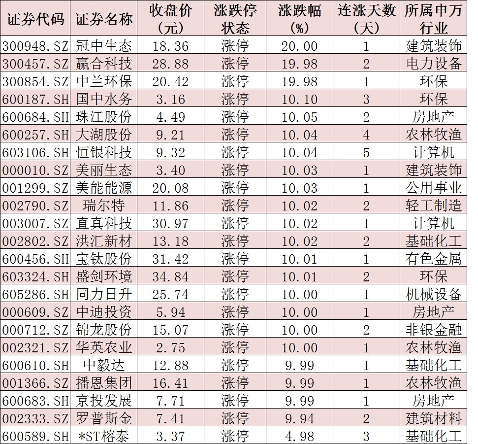 表:今日收盤漲停個股情況: