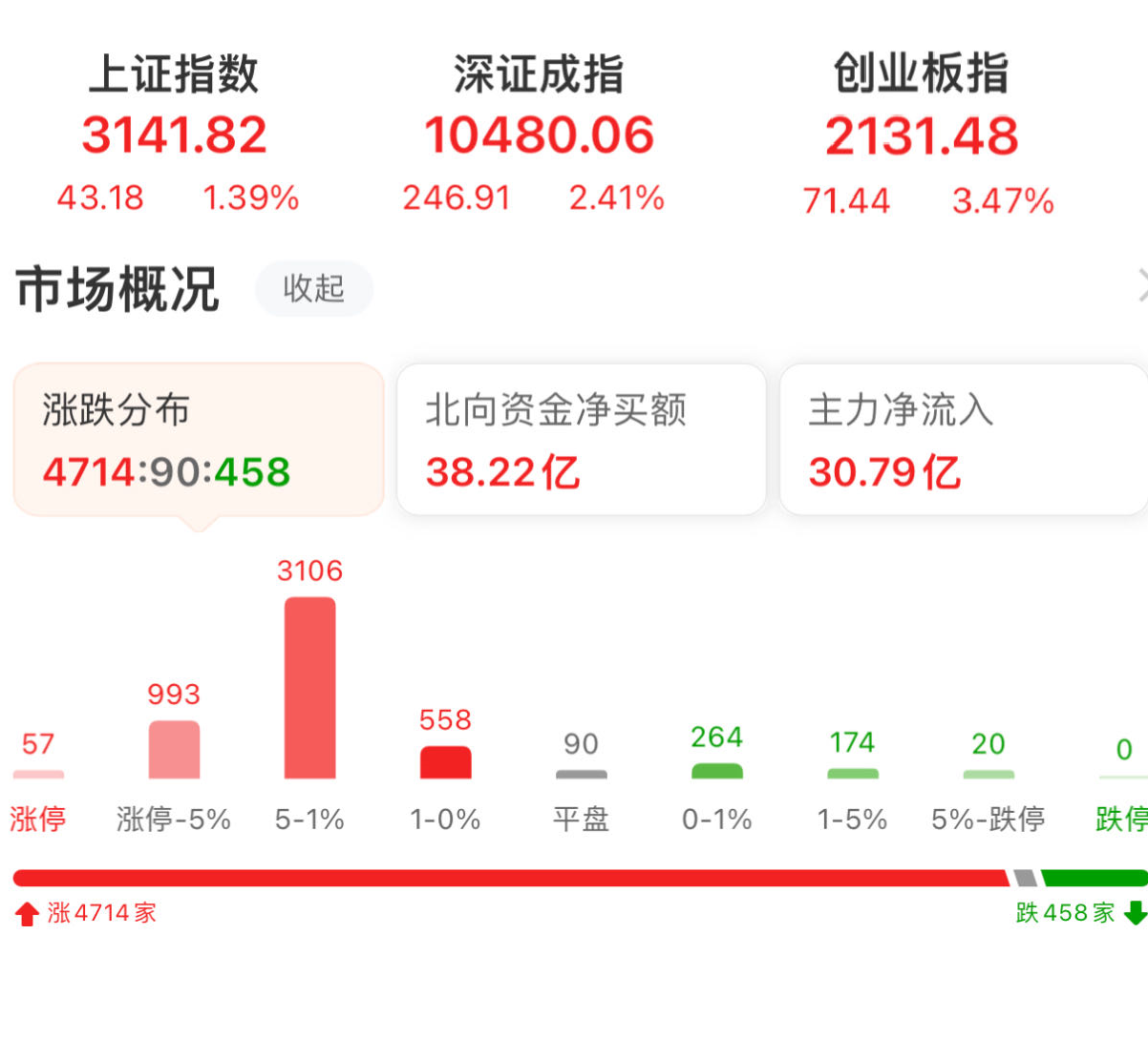 周二(8月29日),三大股指集體漲超1%。截至上午收盤,上證指數(shù)漲1.39%,報3141.82點(diǎn);深證成指和創(chuàng)業(yè)板指分別漲2.41%和3.47%;滬深兩市合計成交額6264.51億元,總體來看,兩市個股漲多跌少,4714只個股上漲,458只個股下跌。其中,57只個股漲停。