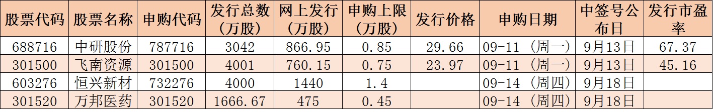 根據發行安排,下周有4只新股發行,其中,9月11日(周一)發行的是飛南資源、中研股份;9月14日(周四)發行的是恒興新材、萬邦醫藥。