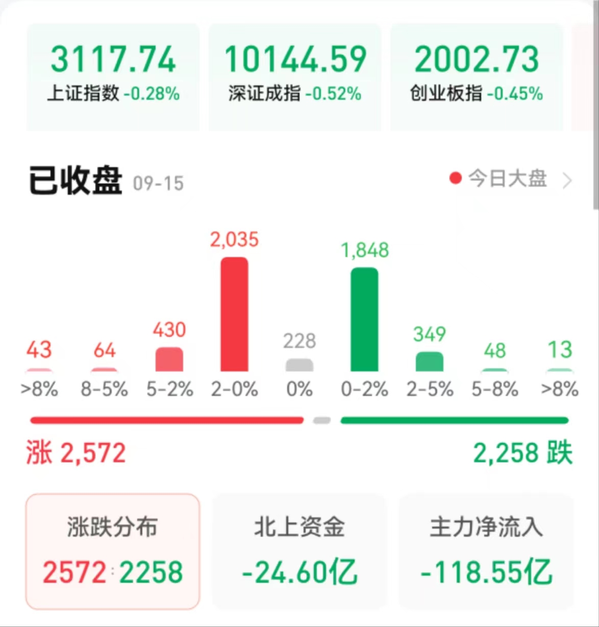 周五(9月15日),A股三大股指震蕩下行,截至收盤,上證指數跌0.28%報3117.74點,深證成指跌0.52%報10144.59點,創業板指漲跌0.45%報2002.73點,兩市合計成交金額達7217.34億元,北向資金凈賣出24.60億元。總體上看,兩市個股漲多跌少。其中,漲停個股達46只,跌停個股達1只。