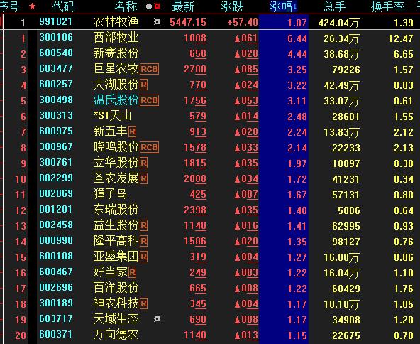 具體看,截至9月20日上午收盤,農林牧漁板塊漲幅居首,達1.07%。其中,西部牧業、新賽股份等概念股漲幅均超4%。