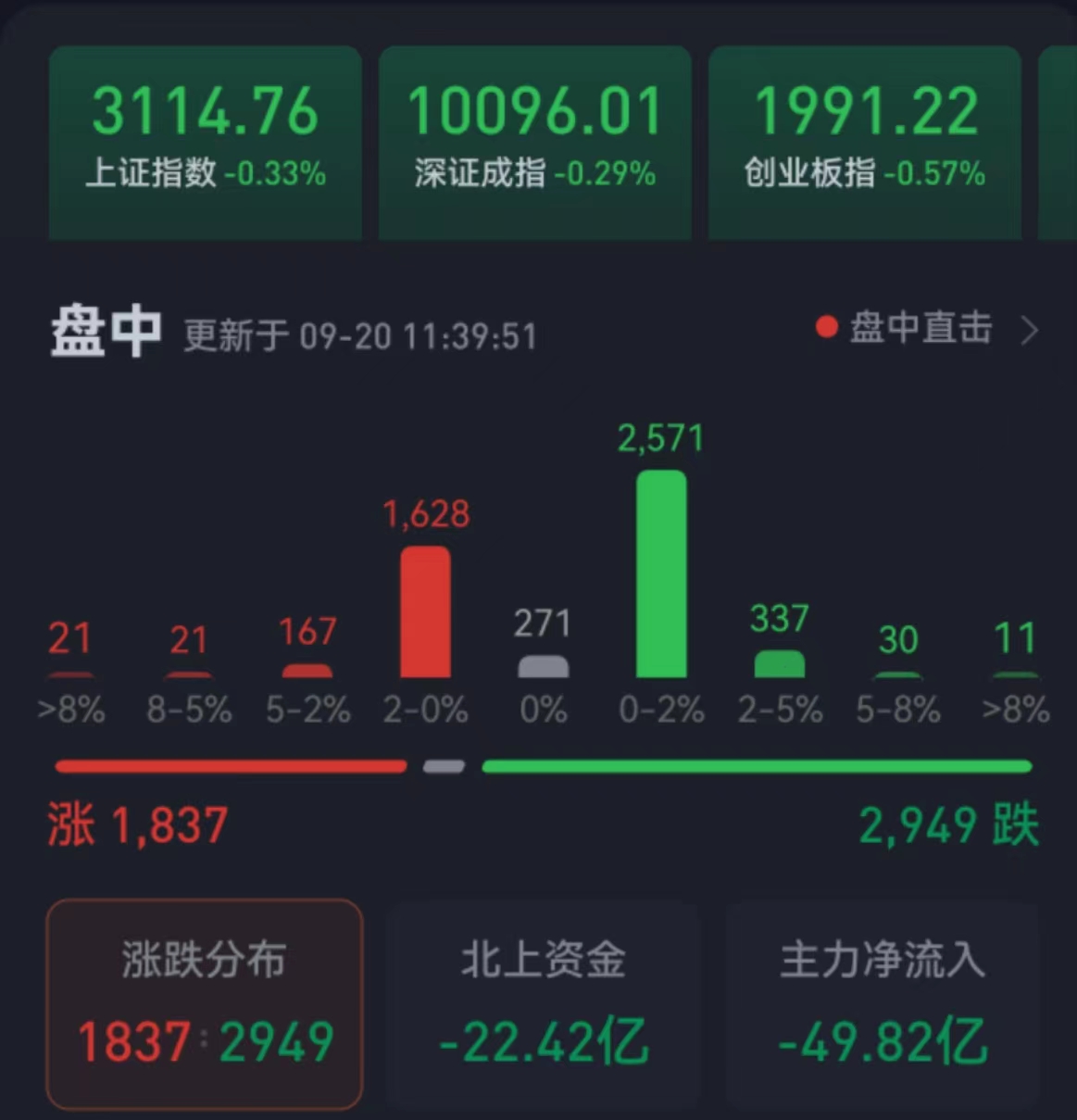 周三(9月20日),三大股指繼續震蕩整理。截至上午收盤,上證指數跌幅達0.33%,報3114.76點;深證成指和創業板指跌幅分別為0.29%和0.57%,創業板指失守2000點整數關口;滬深兩市合計成交額3469.8億元,總體來看,兩市個股跌多漲少,近3000只個股下跌。漲停個股達28只,跌停個股達5只。