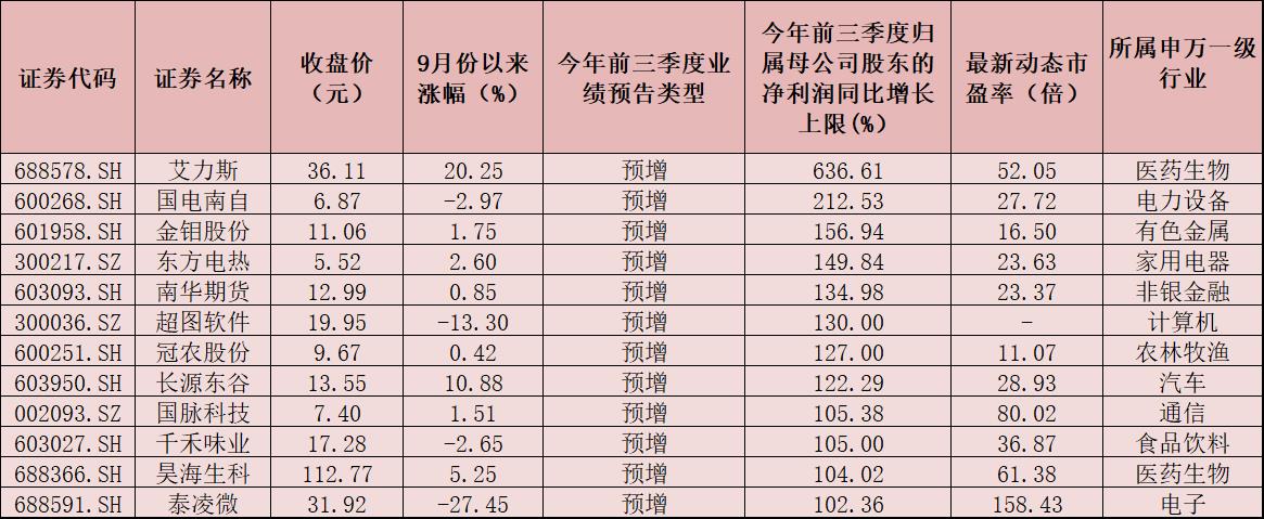 表:12家今年前三季度歸母凈利潤同比增幅上限預計超100%公司一覽
