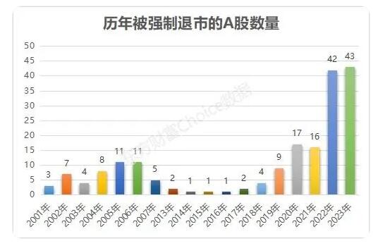 2023年行將結束,從退市公司數量來看,今年又是一個“大年”。東方財富Choice數據顯示,截至12月19日收盤,年內已有43只A股被強制退市,超過2022年的42只,再創歷史新高。