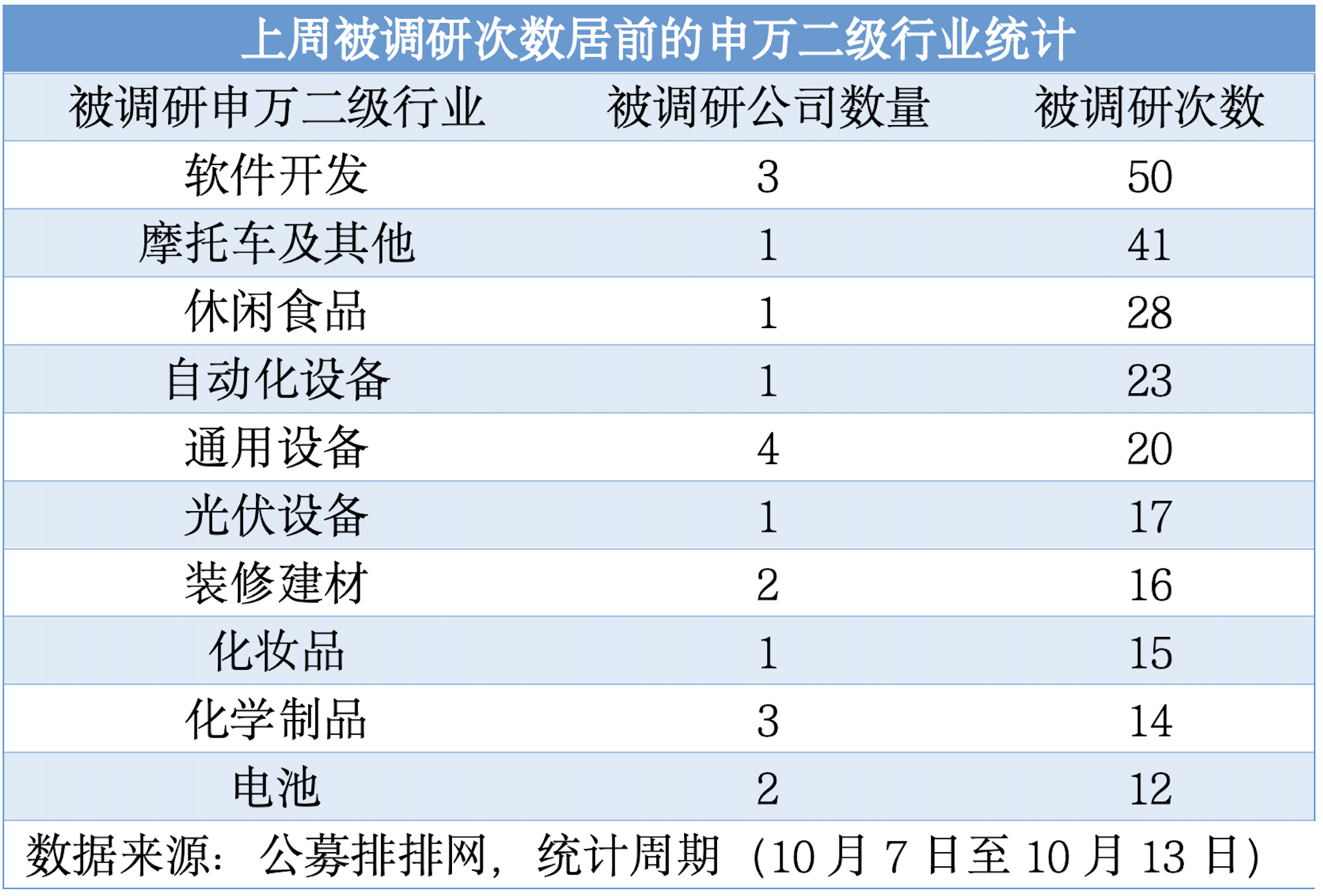 綜合來看,軟件開發行業上周有3家上市公司被公募機構調研50次,無論是被調研次數還是被調研上市公司數量均靠前,成為上周最受公募機構青睞的行業。