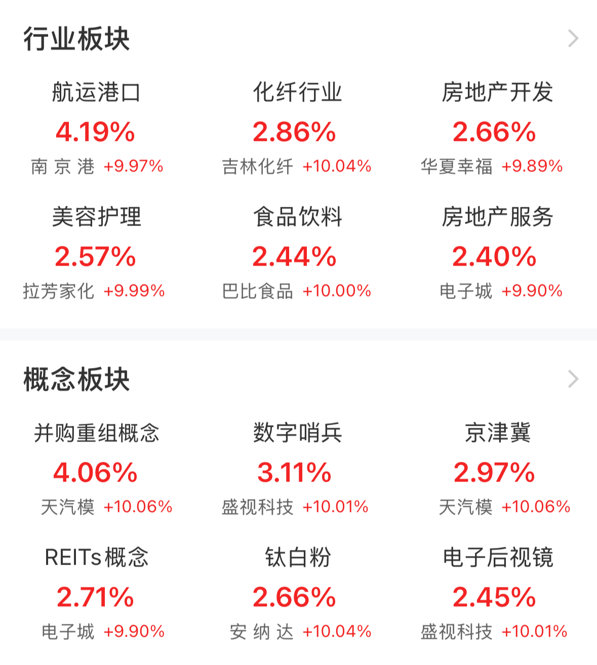 板塊行情中,航運港口、化纖行業、房地產相關產業鏈、食品飲料、美容護理等多板塊活躍。概念板塊中,并購重組概念板塊,全天強勢領漲,截至收盤,該概念板塊大漲4.06%。