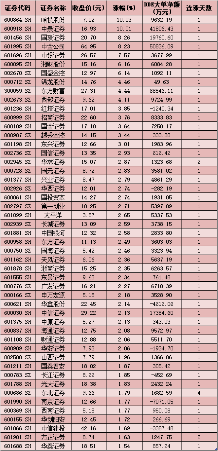 12月17日,券商板塊漲幅達(dá)到3.35%,板塊內(nèi)成份股全線飄紅,哈投股份、中泰證券等兩只個(gè)股聯(lián)袂漲停,國(guó)聯(lián)證券、中金公司、中銀證券、湘財(cái)股份、國(guó)盛金控、錦龍股份、東方財(cái)富、西部證券等個(gè)股漲幅也均在4%以上。