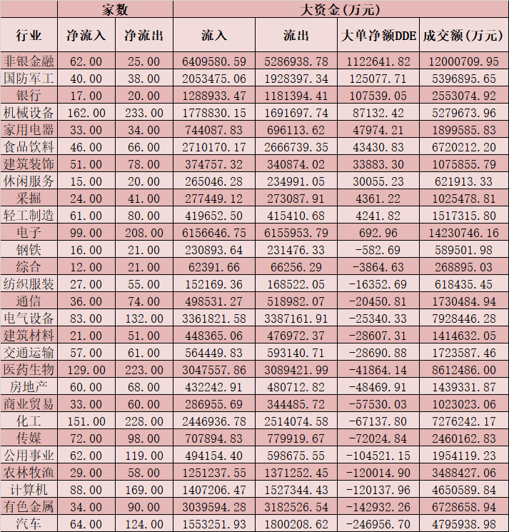 從資金層面看,今日A股大單資金整體凈流入46.09億元,其中,有1572只個股呈現資金凈流入,2474只個股呈現資金凈流出。從申萬一級的28個行業來看,有11個行業呈現大單資金凈流入態勢,其中,非銀金融行業大單資金凈流入居首,達到112.26億元,緊隨其后的國防軍工和銀行等兩行業資金凈流入均超10億元,分別為12.51億元和10.75億元。另外,汽車、有色金屬、計算機和農林牧漁等行業成為大單資金撤離重點。