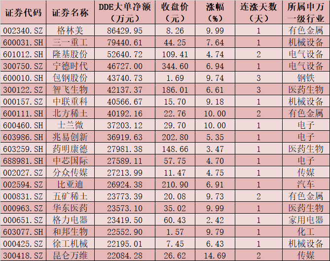 一、周一(3月1日)DDE大單資金凈買入TOP20