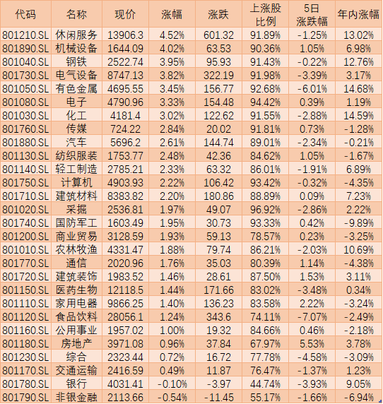 申萬一級(jí)行業(yè)指數(shù)方面,有26類行業(yè)指數(shù)上漲,休閑服務(wù)(4.52%)、機(jī)械設(shè)備(4.02%)、鋼鐵(3.95%)等居前三位,僅非銀金融(-0.54%)、銀行(-0.10%)兩類行業(yè)小幅回落。個(gè)股方面,A股呈普漲格局,漲跌比達(dá)7.44。