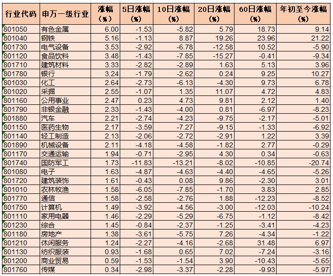 從行業(yè)指數(shù)表現(xiàn)來看,今日申萬一級28個行業(yè)指數(shù)全部實(shí)現(xiàn)上漲,有色金屬行業(yè)指數(shù)領(lǐng)漲,漲6%,鋼鐵行業(yè)指數(shù)緊隨其后,漲5.16%,電氣設(shè)備、食品飲料、建筑材料、銀行等4個行業(yè)指數(shù)漲幅均超3%。