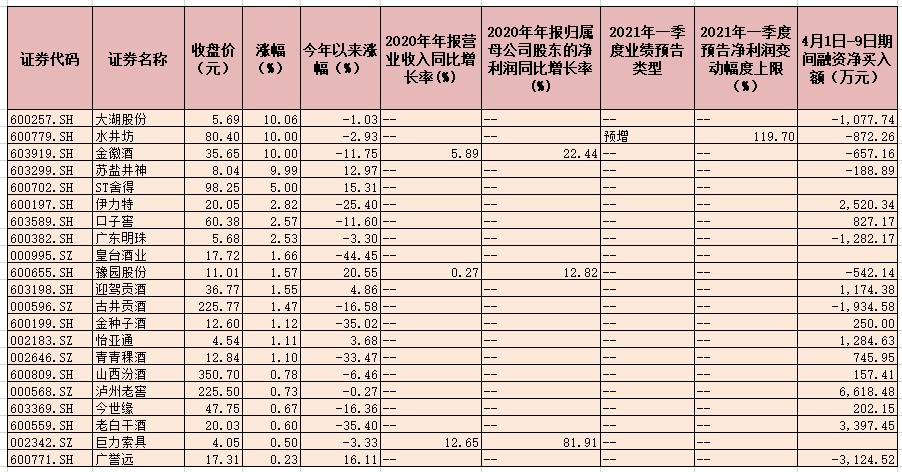 近期部分白酒股也獲得融資客的青睞,4月份以來,截至4月9日,有17只白酒股獲融資客加倉,其中,酒鬼酒、五糧液、洋河股份期間獲融資客凈買入額均超1億元,分別為2.80億元、1.47億元、1.32億元。此外,貴州茅臺、瀘州老窖、老白干酒、中糧科技、伊力特等5只個股期間獲融資客凈買入額也均超2500萬元。