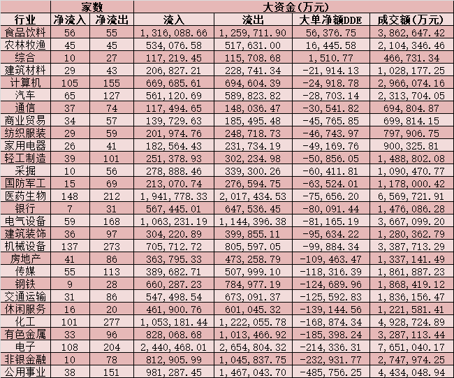 二、周二(4月13日)申萬(wàn)一級(jí)行業(yè)大單資金流向