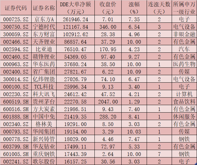 一、周三(4月14日)DDE大單資金凈買入TOP20