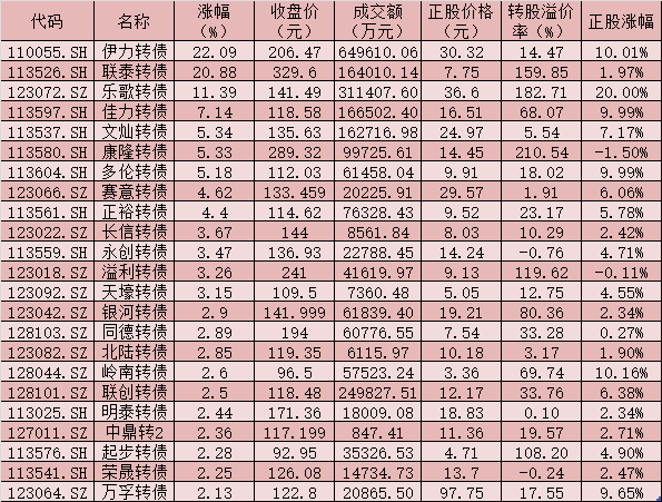 記者進一步統計發現,上述漲幅超2%的23只可轉債中,樂歌轉債、嶺南轉債、伊力轉債、佳力轉債、多倫轉債等5只可轉債的正股價格收獲漲停,萬孚轉債(9.65%)、文燦轉債(7.17%)、聯創轉債(6.38%)、賽意轉債(6.06%)和正裕轉債(5.78%)等5只可轉債的正股價格漲幅也均在5%以上。