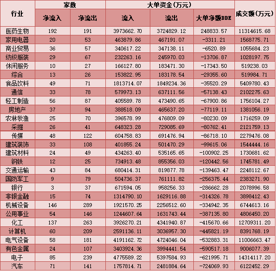 從資金層面看,周三市場(chǎng)呈大單資金凈流出態(tài)勢(shì),為連續(xù)第5個(gè)交易日凈流出,周三DDE大單凈額流出達(dá)567.62億元。行業(yè)方面,僅有醫(yī)藥生物1類(lèi)行業(yè)呈凈流入,流入額248833.57億元。