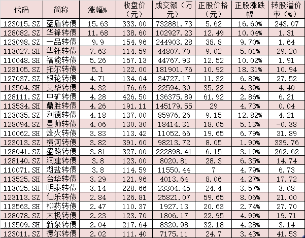 具體到個券方面,在368只可轉(zhuǎn)債中,有24只可轉(zhuǎn)債漲幅超2%,藍盾轉(zhuǎn)債、華鋒轉(zhuǎn)債漲幅均超10%,分別達到15.63%、11.68%,一品轉(zhuǎn)債(9.9%)、華鈺轉(zhuǎn)債(7.63%)、福能轉(zhuǎn)債(5.26%)和拓爾轉(zhuǎn)債(5.1%)等4只可轉(zhuǎn)債漲幅也均在5%以上,表現(xiàn)搶眼。