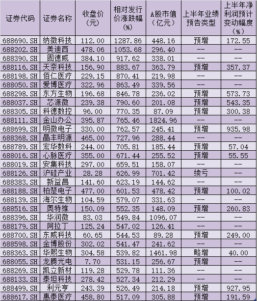 表:最新收盤價較發行價漲幅在500%以上的科創板股一覽
