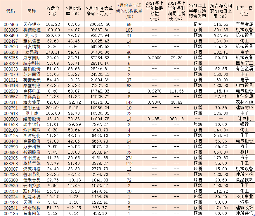表:7月份獲大單資金追捧的2021年上半年凈利潤實現或有望實現同比增長個股