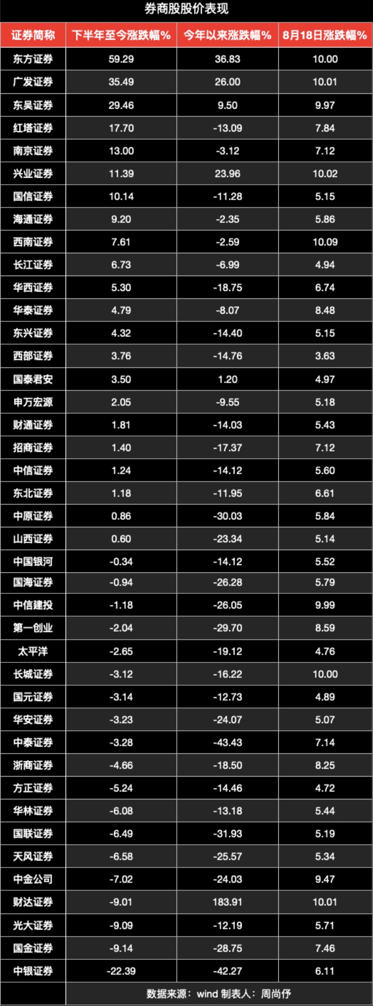 此外,券商股在二級市場的走勢分化也十分明顯。下半年以來,中銀證券的股價跌幅超20%,還有包括國金證券、光大證券在內的19只券商股依舊處于下跌狀態。