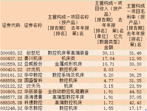 通過表格可以發(fā)現(xiàn),去年主營構(gòu)成第一位是機(jī)床類項目的12家公司,項目收入均超1.55億元,其中,創(chuàng)世紀(jì)數(shù)控機(jī)床等高端裝備收入30.11億元,毛利率31.46%。此外,秦川機(jī)床和亞威股份的這一項目收入也超過10億元。