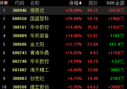 從熱點(diǎn)板塊來看,漲幅榜前10位的板塊近5日漲幅有5個超過10%,顯示A股部分板塊持續(xù)性較好。工業(yè)母機(jī)再次登上同花順指數(shù)漲幅榜首,不過,板塊DDE資金卻出現(xiàn)1.04億元的凈流出,有包括國盛智科、恒而達(dá)在內(nèi)的5只個股漲停。