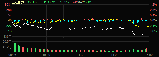 8月26日,A股三大指數(shù)持續(xù)走弱,集體跌超1%,截至收盤,上證指數(shù)跌1.09%,深證成指跌1.92%,創(chuàng)業(yè)板指跌2.51%;滬深兩市合計成交額13743.07億元,兩市成交額連續(xù)第27個交易日突破1萬億元;北向資金凈買入12.29億元。