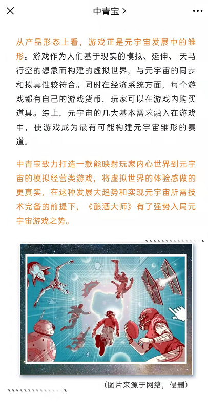 今日早盤,“元宇宙”概念的爆發與一則消息有關。中青寶在官方微信上表示,將推出虛擬與現實夢幻聯動模擬經營類的元宇宙游戲《釀酒大師》,這是一次打破次元壁的嘗試,游戲與真實邊界開始走向消融。