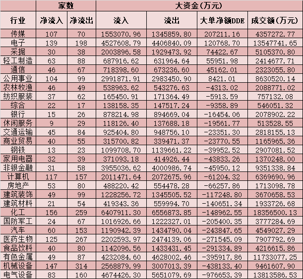 資金流向方面,周三,滬深兩市大單資金凈流出307.72億元,其中,1679只個股呈現資金凈流入,2755只個股呈現資金凈流出。從申萬一級行業來看,僅6個行業呈現資金流入態勢。傳媒和電子等兩行業大單資金凈流入均在10億元以上。