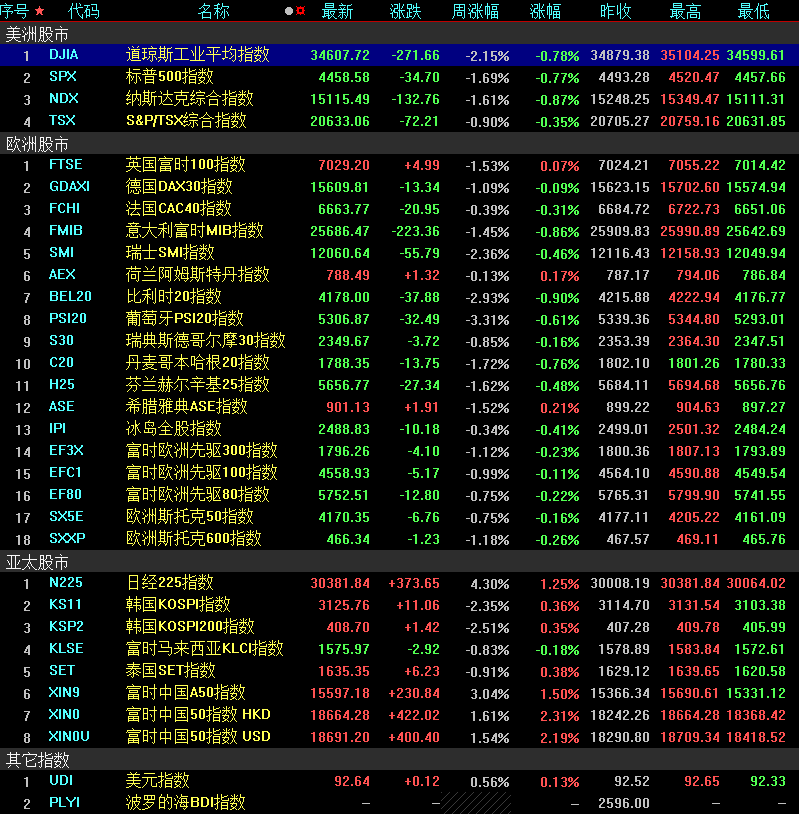歐股上周普遍下跌,德國DAX指數周跌幅1.09%,法國CAC40指數周跌幅0.39%,英國富時100指數周跌幅1.53%。亞太主要股指出現分化,日經225指數周漲幅4.30%,韓國KOSPI指數周跌幅2.35。