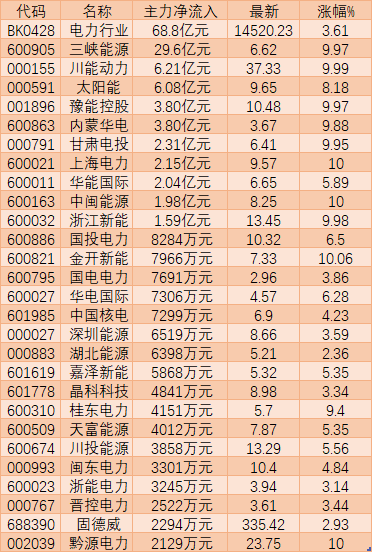電力板塊震蕩走高,截至9月17日收盤,電力板塊整體漲3.61%,居東方財富行業板塊之首,同時,資金凈流入達68.8億元,交易的83只個股中,有68只凈流入,三峽能源(29.6億元)、川能動力(6.21億元)、太陽能(6.08億元)、豫能控股(3.80億元)、內蒙華電(3.80億元)等5只個股大單凈流入均超3億元。