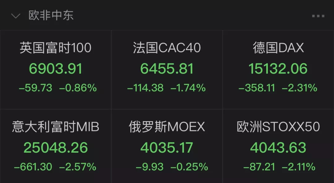 與此同時,歐洲主要國家股指跌幅均超1%,其中,德國DAX 30指數收跌2.3%,也創下7月19日以來最大跌幅。