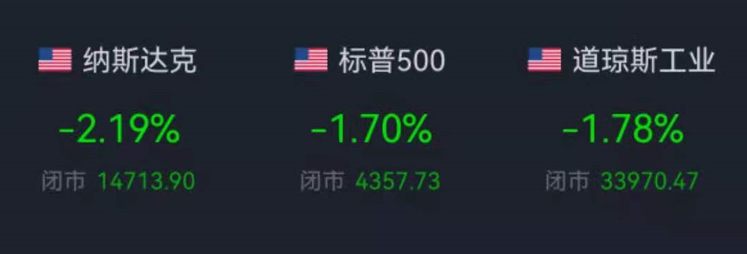 可以看到,周一,美股三大指數集體重挫。截至收盤,道瓊斯工業指數跌1.78%,報33970.47點;標普500指數跌1.70%,報4357.73點;納斯達克指數跌2.19%,報14713.90點;納指和標普500指數創4個月以來最大單日跌幅。