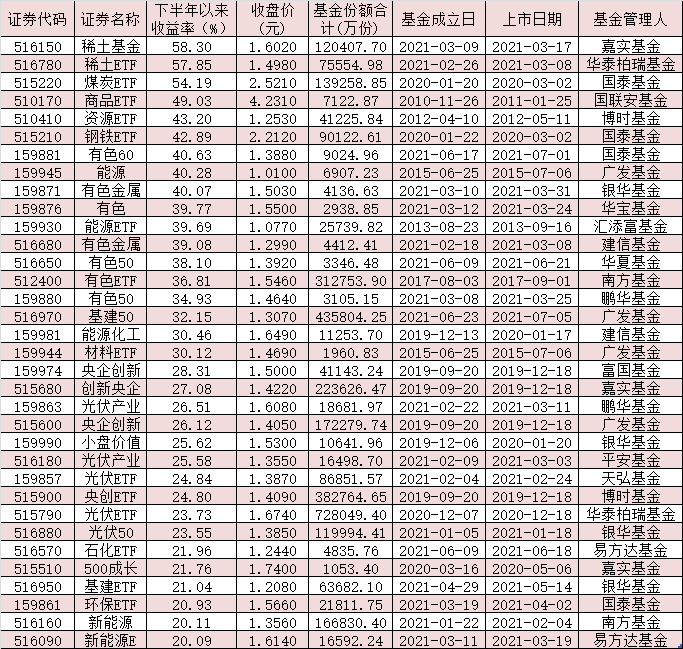 同花順數據統計發現,截至9月23日收盤,在562只ETF基金中,有212只ETF基金下半年以來取得正收益,其中,有34只ETF基金下半年以來收益率均超20%,稀土基金(516150)、稀土ETF(516780)、煤炭ETF(515220)等3只ETF基金期間收益率均在50%以上,分別為58.30%、57.85%、54.19%,商品ETF(510170)(49.03%)、資源ETF(510410)(43.20%)、鋼鐵ETF(515210)(42.89%)、有色60(159881)(40.63%)、能源(159945)(40.28%)和有色金屬(159871)(40.07%)等6只ETF基金期間均獲40%以上的收益率,絕大部分是周期類ETF基金。