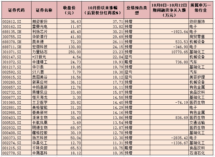 表:10月份以來漲幅超10%的業績預喜股一覽