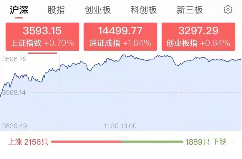 強勢震蕩!周二,A股三大指數震蕩走強,集體收漲。截至收盤,上證指數漲幅達0.7%,報3593.15點,深證成指漲幅達1.04%,報14499.77點,創業板指漲幅達0.64%,報3297.29點;兩市合計成交9733億元,略有萎縮,北向資金凈流入39.06億元。